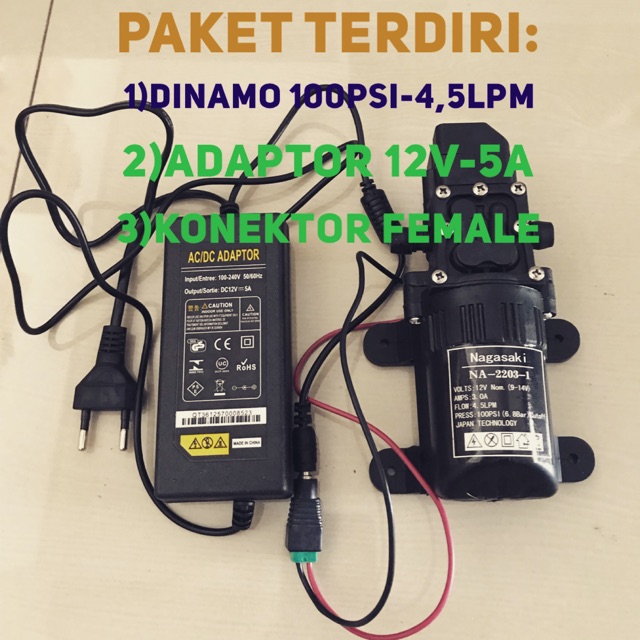 Barang sesuai foto:1 unit pompa Nagasaki + 1 unit adaptor + 1 jack FemaleSpesifikasi :12 Volt4.0 Liter Per Menit3.0 AmpereAuto Cut Off (Otomatis Mati Sendiri jika aliran air ditutup)Spesifikasi Adaptor AC-to-DCInput : 100-240 V -50/60Hz12 volt 5 Ampereini gan..TERBARU & TERMURAHYang paket ini sudah ada adaptor nya. sudah dilengkapi dengan otomatis cut off. mesin akan mati sendiri bila aliran pada output ditutup. dan akan hidup lagi bila aliran air pada output di buka lagi.Aplikasi Produk:1. Cuci motor & Mobil2. Service Ac/membersihkan AC3. Semprot Hama4. Siram Tanaman5. Pendingin Ruangan6. Sho