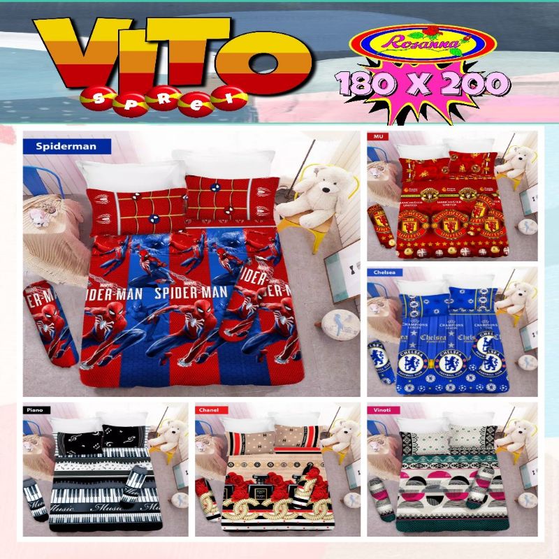 LUNTUR GANTI 3 !!!3D High Definition Digital PrintingDisperse Print TechnologyJahitan LEBIH RapatKAIN HALUS, LEMBUT, TIDAK BERBULUBAHAN:Kain: Katun MicrotexSprei Vito Disperse Plat King Bantal 2 180x200CONTENTS:1 pc Sprei Plat King Size2 pcs Sarung Bantal Plat2 pcs Sarung GulingDIMENSIONS:Sarung Bantal Plat: 68 cm x 48 cmSarung Guling: 100 cm x 34 cmSprei Plat King Size: 180 cm x 200 cm Tinggi 20 cm Sprei Vito Disperse Plat King Bantal 4 180x200CONTENTS:1 pc Sprei Plat King Size 4 pcs Sarung Bantal Plat2 pcs Sarung GulingDIMENSIONS:Sarung Bantal Plat: 68 cm x 48 cmSarung Guling: 100 cm x 34 cmSprei Plat King Size: 180 cm x 200 cm Tinggi 20 cmSprei Vito Disperse Plat Queen Bantal 2 160x200CONTENTS:1 pc Sprei Plat Queen Size2 pcs Sarung Bantal Plat2 pcs Sarung GulingDIMENSIONS:Sarung Bantal Plat: 68 cm x 48 cmSarung Guling: 100 cm x 34 cmSprei Plat Queen Size: 160 cm x 200 cm Tinggi 20 cmSprei Vito Disperse Plat Single 120x200CONTENTS:1 pc Sprei Plat Single Size 1 pc Sarung Bantal Plat1 pc Sarung GulingDIMENSIONS:Sarung Bantal Plat: 68 cm x 48 cmSarung Guling: 100 cm x 34 cmSprei Single Size: 120 cm x 200 cm Tinggi