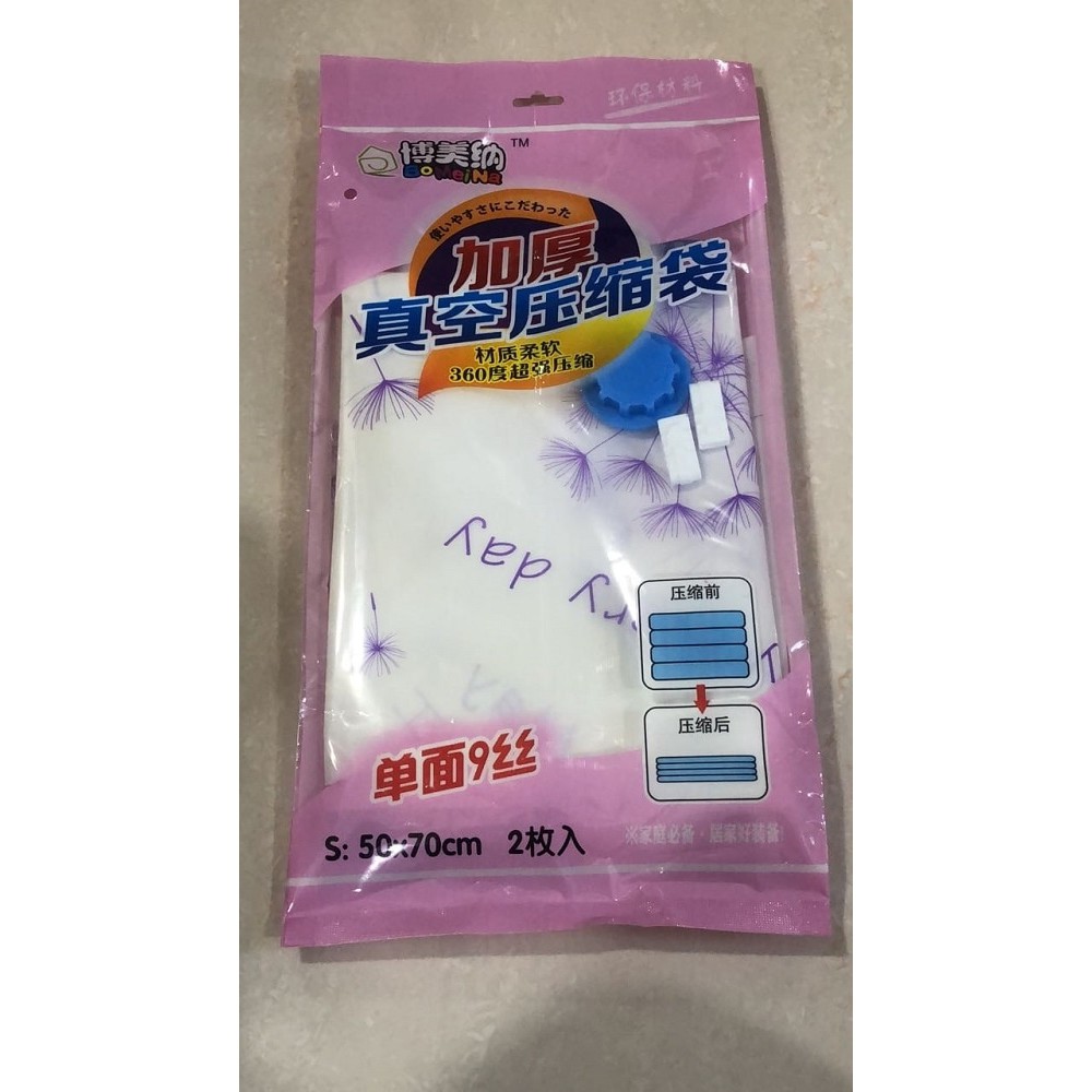 Plastik Vacuum Bag Ukuran 50Cm x 70CM.Merek Bomeina. Bahan jauh lebih bagus dan kuat dibandingkan merek yg lain.Kualitas plastik High Quality, tebal dan kuat.Ada harga, ada barang.Isi 2pcs per paket.ini adalah plastik tambahan/refill untuk produk vacuum yang menggunakan