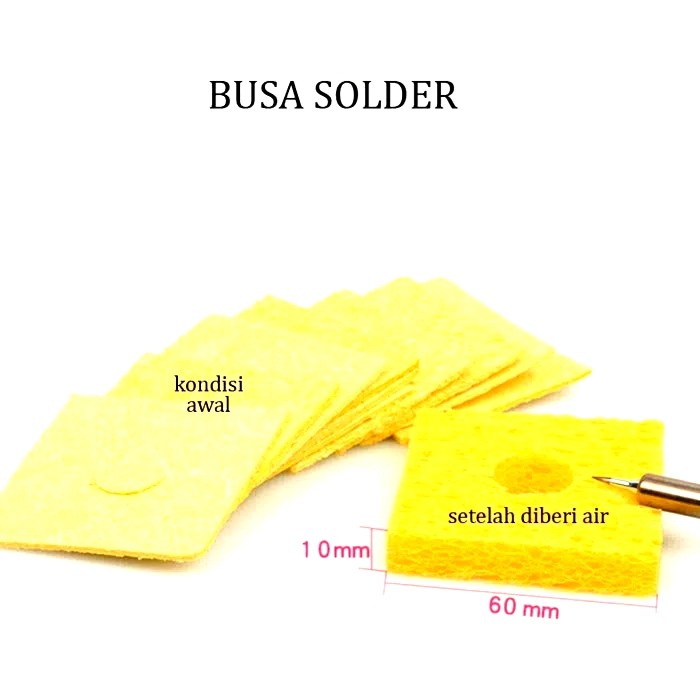 Busa Solder 6cmSpesifikasi produk.-) Dimensi sebelum diberi air : 55*55*2 mm-) Dimensi setelah diberi air : 60*60*10 mm-) Ukuran : 6*6 cm-) Tinggi sebelum diberi air : 0.2 cm-) Tinggi sesudah diberi air : 1 cmCara kerjanya : Ketika Busa Solder diberi air, maka Busa akan mengembang dari 55*55*2mm menjadi 60*60*10mm,. Ketika spons kering, maka Spons akan menciut seperti ukuran se